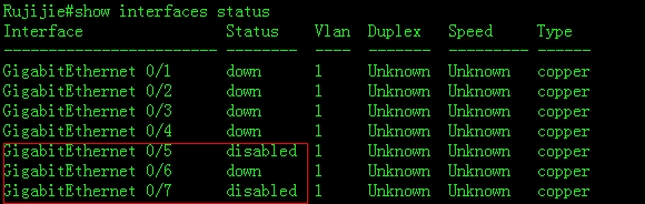 *Mar 19 20:16:02: %LINEPROTO-5-UPDOWN: Line protocol on Interface GigabitEthernet 0/7, changed state to down.3、查看接口状态,发现这两个口被disable了